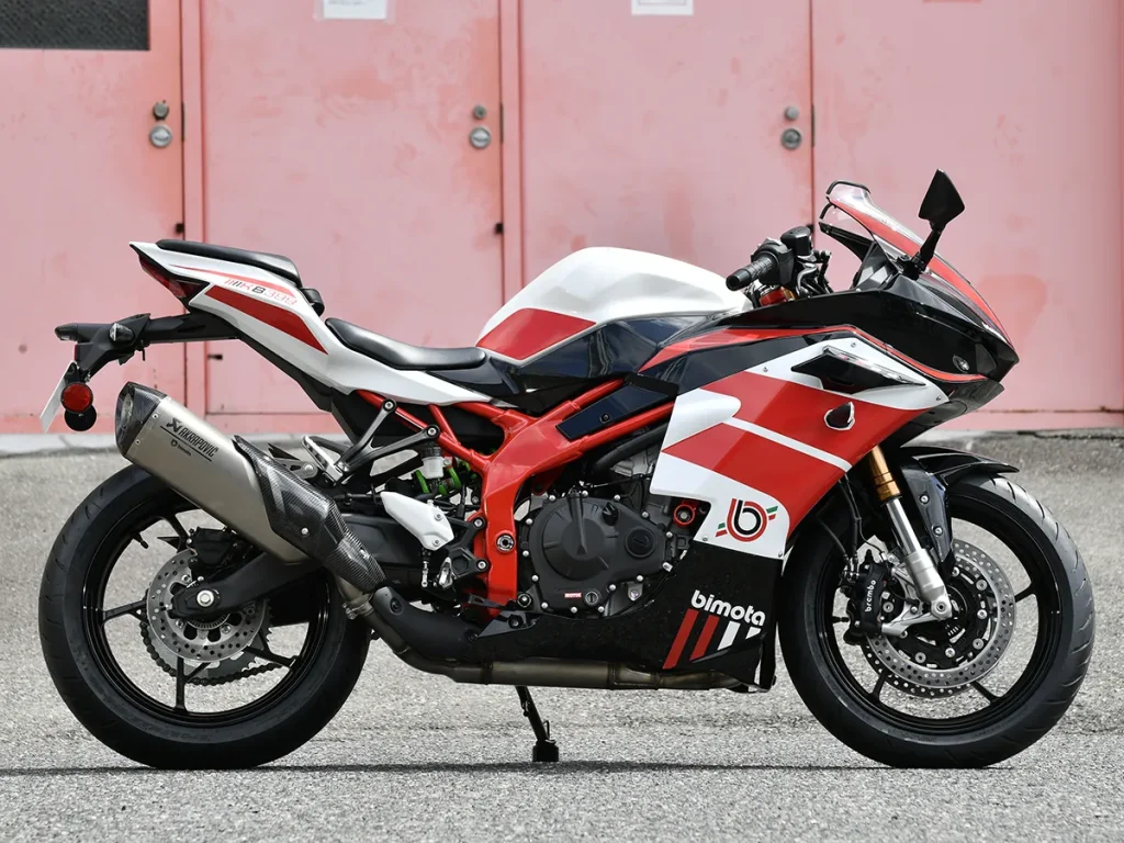 從正面看去,中央的大型進氣口與兩側定風翼共同營造出非常鮮明的運動形象;側面油箱上醒目的 bimota 字樣,也讓整體品牌辨識度非常強烈。