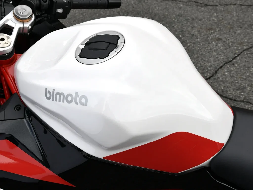 - 造型銳利的油箱上,醒目的「bimota」Logo 格外耀眼。