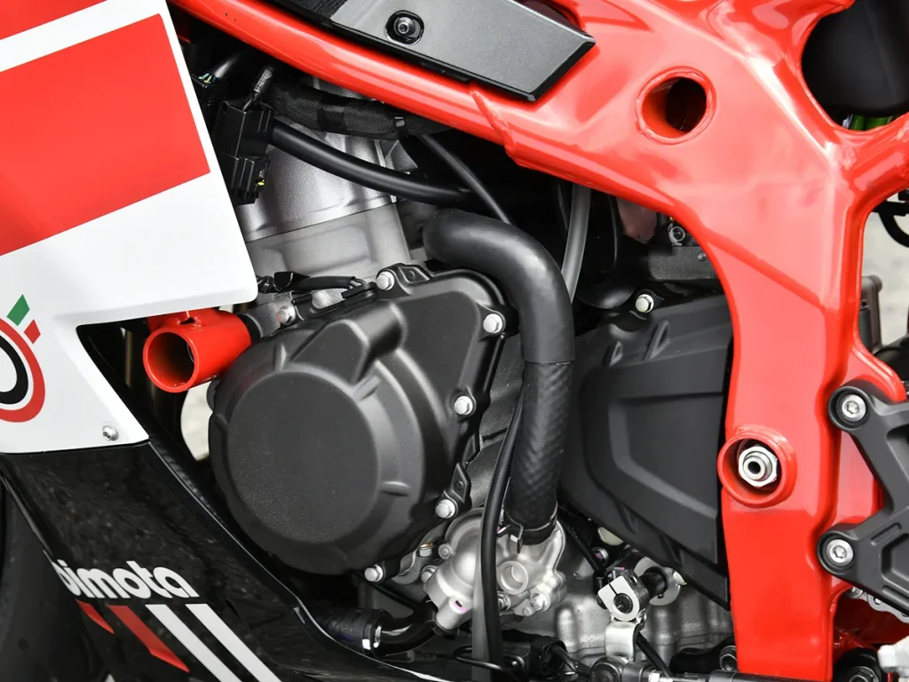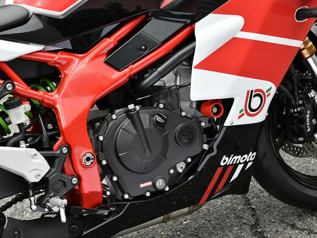 - 車架雖源自 ZX-4R,但透過專屬的紅色塗裝,完美詮釋了 BIMOTA 的品牌氛圍