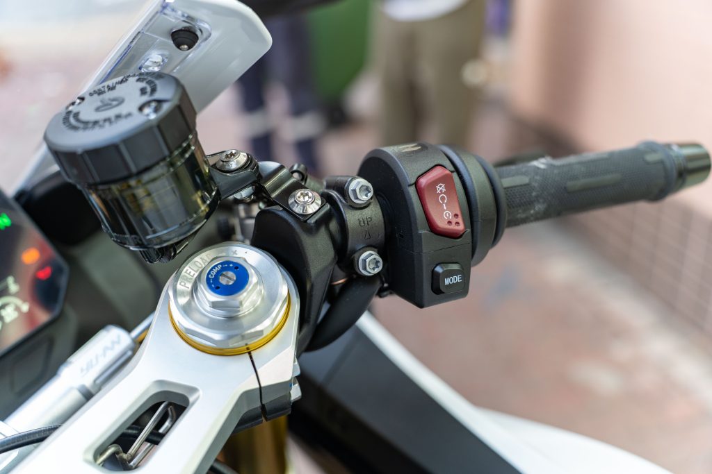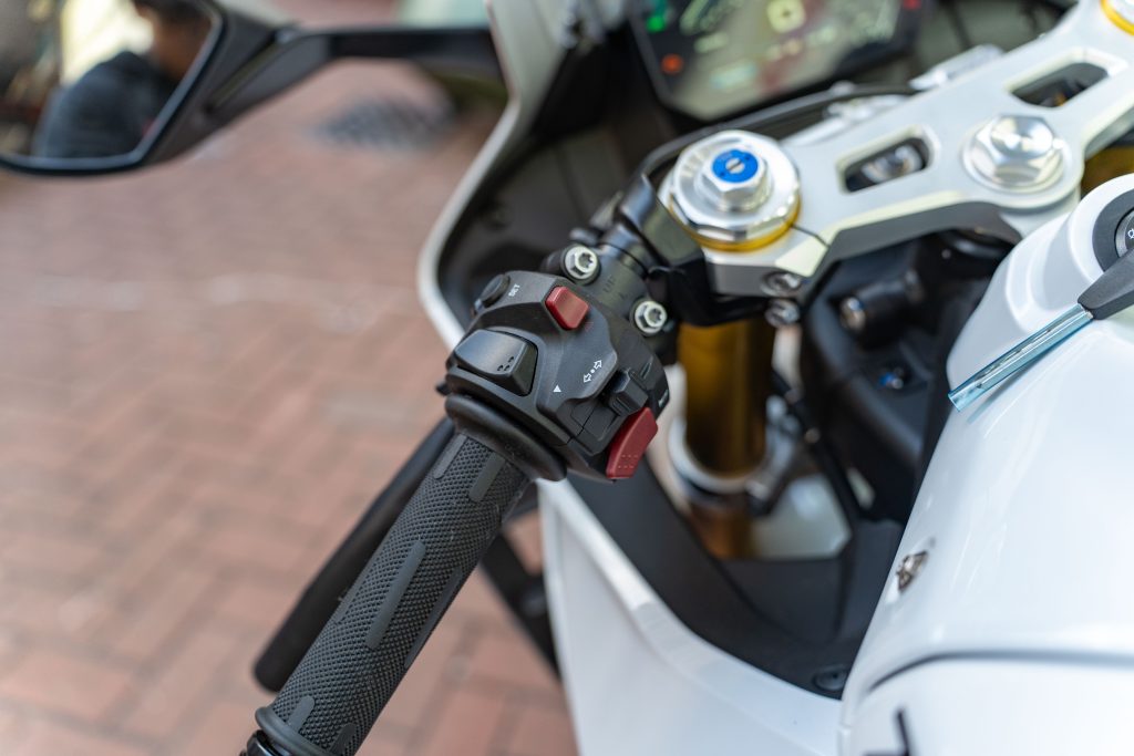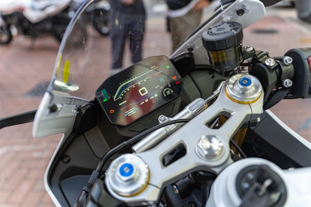 坐進駕駛艙,映入眼簾的是一組大尺寸的 TFT 全彩液晶儀表,提供豐富的行車資訊與電控系統顯示,動力模式可調,配備6軸IMU,彎道ABS,循跡控制系統。分離式把手的設定營造出戰鬥的騎乘三角同時配備防甩頭,左側開關總成也配備了多功能方向鍵,方便騎士在騎乘時快速切換儀表選單或電控模式。