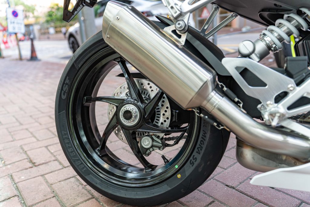 單搖臂與粗胎設定: 車尾最大的亮點絕對是那組造型優美的單搖臂,完美展現了鋁合金輪框的工藝之美。原廠配備了 CST (正新) Ride Migra S5 運動性能胎,後輪尺寸更來到霸氣的 180/55ZR17,不僅視覺張力與抓地力一次滿足,同時提供更大的傾角。