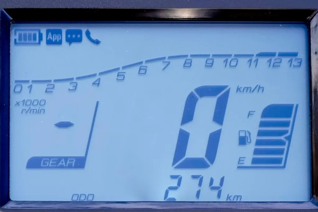 - 螢幕為液晶(LCD)多功能顯示器。雖然是單色配置但閱讀性佳,螢幕兩側配置了各類警告燈號