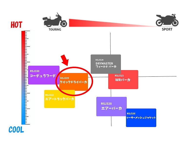 與其他外套相比,RSJ335 QUICK DRY 連帽防摔外套具有強烈時尚感,還具有出色的伸縮及防潑水等機能,因此相當推薦給想要長途騎乘旅行的騎士穿著。